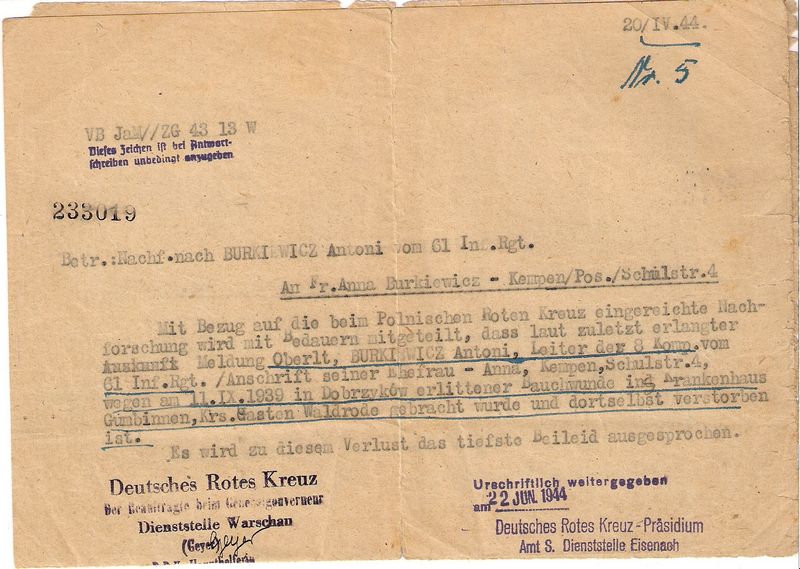 KomentarzeSzanowna Redakcjo Uzupełniłam w dniu dzisiejszym informacje na temat por. Antoniego Burkiewicza - bohatera września 1939, obrońcy Dobrzykowa. W/w był pierwszym mężem mojej babci. Jestem w posiadaniu wielu cennych zdjęć, które postaram się Państwu przesłać. Uzupełnię również inne dane na temat por. Burkiewicza, dane jego rodziców, rodzeństwa oraz w miarę możliwości przebieg służby. Z poważaniem Joanna dodany przez: joanka, 2012-08-29Serdecznie dziękujemy za uzupełnienie biogramu i z niecierpliwością oczekujemy na nowe informacje oraz pamiątki związane z jednym z Bohaterów Bitwy nad Bzurą. dodany przez: redakcja, 2012-08-29Pierwsze zdjęcie Antoni Burkiewicz z żoną Anną, zdjęcie zdjęcie. Drugie zdjęcie Antoni Burkiewicz. Trzecie zdjęcie - Ofiarowanie broni przez społeczeństwo. Pierwszy z lewej por. Antoni Burkiewicz, salutuje marsz. Rydzowi - Smigłemu. dodany przez: joanka, 2013-01-28Witaj Joanno. Ja jestem wnuczką Jadwigi z domu Burkiewicz, Siostry Antoniego. Dopiero dziś trafiłam na ten portal. Cieszę się, że pamięć o Antonim nie przemija. Pozdrawiam i też z niecierpliwością czekam na kolejne informacje. pozdrawiam - Joanna dodany przez: asia, 2013-10-12Witaj Joanno Wysłałam dziś do redakcji prośbę o kontakt z Tobą (email). Ja jestem wnuczką Anny Burkiewicz, żony Antoniego Burkiewicza. Mam nadzieje, że się bliżej poznamy. W tym roku (we wrześniu) przypada 75 -lecie walk pod Dobrzykowem, gdzie najprawdopodobniej zginął Antoni. Nawiązałam kontakt z Panią Dyrektor SP w Dobrzykowie, która serdecznie zaprasza na obchody. To niesamowite, że w ten właśnie sposób się poznajemy - przez naszych przodków. Pozdrawiam Twoja imienniczka dodany przez: joanka, 2014-01-12Witaj! Z niecierpliwością czekałam na wiadomość od Ciebie. Wyraziłam zgodę na przekazanie adresu emil więc teraz będzie nam łatwiej- niestety nie jestem zbyt lotna w kwestii komputerowej, ale spokojnie, na emila odpowiem :)To niesamowite, co piszesz...Twoje zaangażowanie w Tą sprawę...jestem pod wrażeniem, aż mi słów brakuje. Masz rację- poznajemy się przez przez przodków- ale czy to nie cudowne!!!POZDRAWIAM i czekam na wiadomość- Asia dodany przez: asia, 2014-01-14Na dwóch ostatnich zdjęciach grupowych, postać por. Antoniego Burkiewicza, zaznaczona jest czerwoną kropką. Pierwsze zdjęcie jest zrobione w Bydgoszczy, natomiast drugie prawdopodobnie w Zegrzu. dodany przez: joanka, 2014-01-20Dzień dobry. Czy ktoś tu jeszcze zagląda? Joanno, co u Ciebie? Pozdrawiam serdecznie. Asia dodany przez: asia, 2023-09-19Witaj Asiu. Zaglądam. Czasem świeczkę zapalę. U mnie wszystko dobrze. A co u Ciebie? dodany przez: joanka, 2023-10-19Joanno, jak dobrze Cię "słyszeć". U nas jakoś leci. Na razie zdrowia dopisuje więc nie ma co narzekać. Mój tata - Andrzej Kominek, dopytuje, co u Rwojego Taty.... Wiesz, mamy plan - jak Bóg da i dożyjemy - jechać do Dobrzykowa na 1 września 2024. 85 rocznica śmierci Antoniego. Bardzo bym chciała. Każdego roku myślałam o tym, ale w przyszłym, to już postanowione. Dziś, jutro szczególne dni... Pamiętamy również o Antonim. Opowiadam przy świątecznym obiedzie córce i dzieciom mojego rodzeństwa. Warto, TRZEBA pamiętać! Ściskam, pozdrawiam i jeszcze raz dziękuję za wiadomość :) Będę wdzięczna za informację, co u p. Wojtka - możesz pisać na e-maila jacekasia@poczta.fm Jeśli korzystasz z Facebooka, daj znać. Mój profil Asia Szczepaniak. Znajdziemy się. Do usłyszenia. dodany przez: asia, 2023-11-01Joanno, jak dobrze Cię "słyszeć". U nas jakoś leci. Na razie zdrowia dopisuje więc nie ma co narzekać. Mój tata - Andrzej Kominek, dopytuje, co u Rwojego Taty.... Wiesz, mamy plan - jak Bóg da i dożyjemy - jechać do Dobrzykowa na 1 września 2024. 85 rocznica śmierci Antoniego. Bardzo bym chciała. Każdego roku myślałam o tym, ale w przyszłym, to już postanowione. Dziś, jutro szczególne dni... Pamiętamy również o Antonim. Opowiadam przy świątecznym obiedzie córce i dzieciom mojego rodzeństwa. Warto, TRZEBA pamiętać! Ściskam, pozdrawiam i jeszcze raz dziękuję za wiadomość :) Będę wdzięczna za informację, co u p. Wojtka - możesz pisać na e-maila jacekasia@poczta.fm Jeśli korzystasz z Facebooka, daj znać. Mój profil Asia Szczepaniak. Znajdziemy się. Do usłyszenia. dodany przez: asia, 2023-11-01Radosnych Świąt Bożego Narodzenia dla wszystkich, którzy się tu pojawiają ✨️🎄✨️ dodany przez: asia, 2023-12-24Asiu, odezwij się proszę. Pisałam do Ciebie e-maila informując o naszej wyprawie śladami Antoniego. Pozdrawiam Asia dodany przez: asia, 2024-09-24